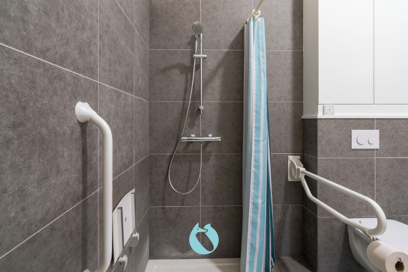 Inkom, keuken met zithoek, groot zonneterras, ruime slaapkamer met aanpalend ingerichte badkamer met toilet, lavabo en inloopdouche.